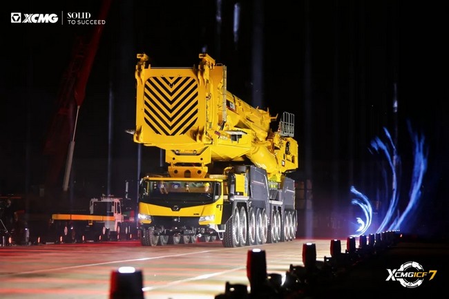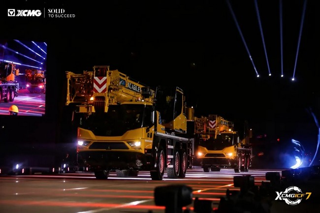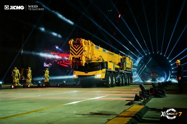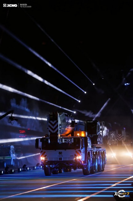 引擎轰鸣中,16台徐工起重机启程,驶向全球,灯光在夜幕中汇成“时光隧道”,照亮远征之路。