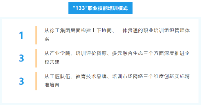 徐工技师学院是由中国工程机械行业领军企业徐工集团独资兴办的技工院校,紧跟徐工发展战略,依托徐工江苏省“1650”产业体系工程机械产业链链主作用,在组建创新联合体,推动产业链、教育链、人才链深度融合创新方面具有独特优势,探索形成了具有徐工特色的“133”职业技能培训模式,在促进职业培训强链补链延链上不断拓展新市场、展现新作为。