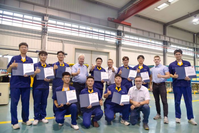 6月,首届“蓝海精英”中德国际班38名学生全部通过德国工业机械师职业资格认证。他们持有IHK德国工商业行会标准培训证、国内技师职业技能等级证、全国英语等级考试三级合格证、工程机械主机操作工证及技师学院毕业证五个证书,是具备国际视野,水平过硬、语言过关、文化认同、机电液、装调服、跨产品融通海外服务技能人才,毕业即被13家企业接收转正。目前,他们中部分已奔赴海外,服务徐工国际化拓展。年内,学院为企业输送500余名学生,企业满意度达90%以上。