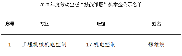 根据文件精神,2020年度劳动出版“技能雏鹰”奖学金设1人。目前,在各班级评比、审核、推荐的基础上,学生工作与品牌文化部已对各班级申报2020年度劳动出版“技能雏鹰”奖学金学生资格进行了审核。现将符合条件名单在学校官网予以公布,接受全院师生的监督。
